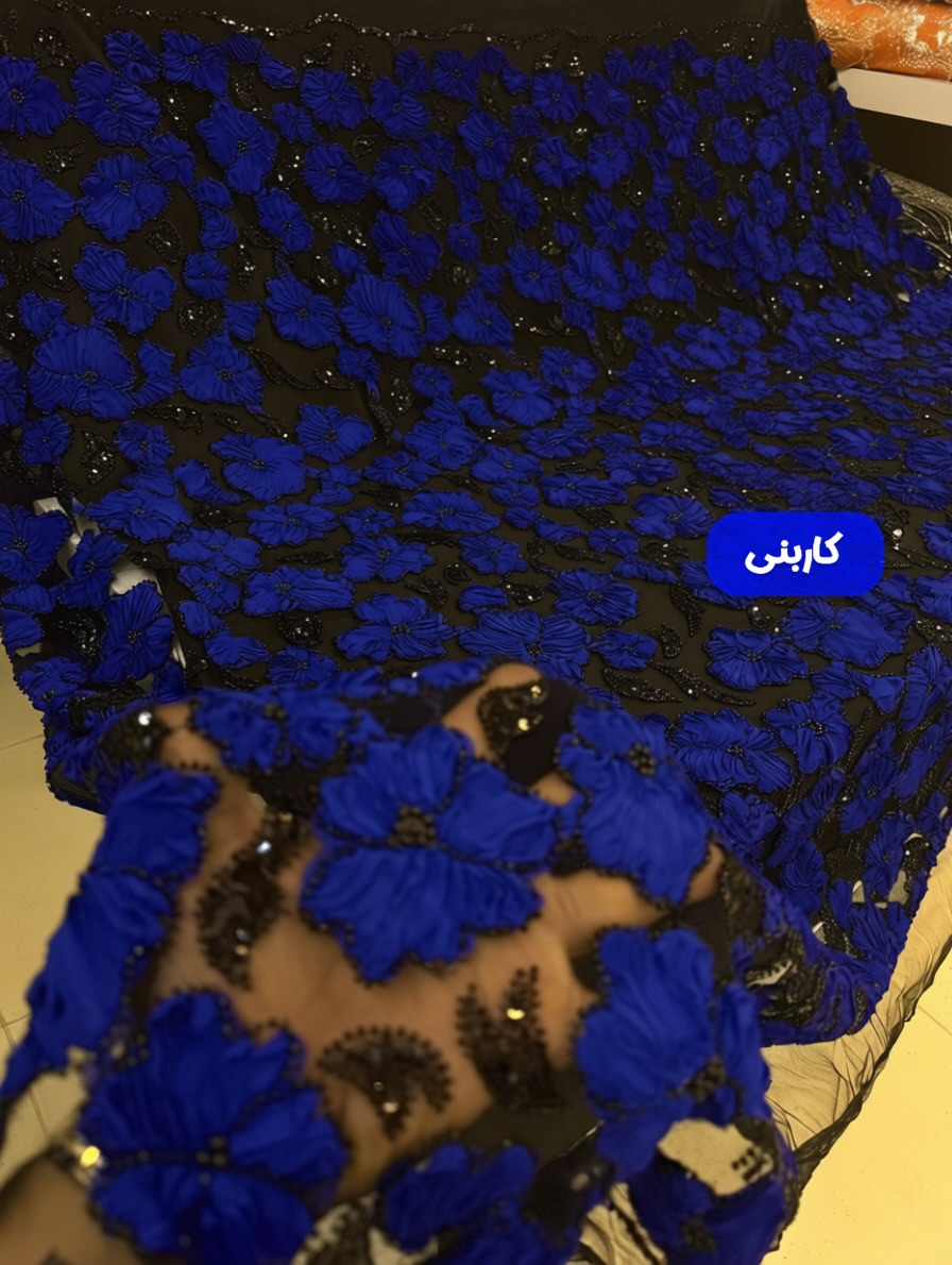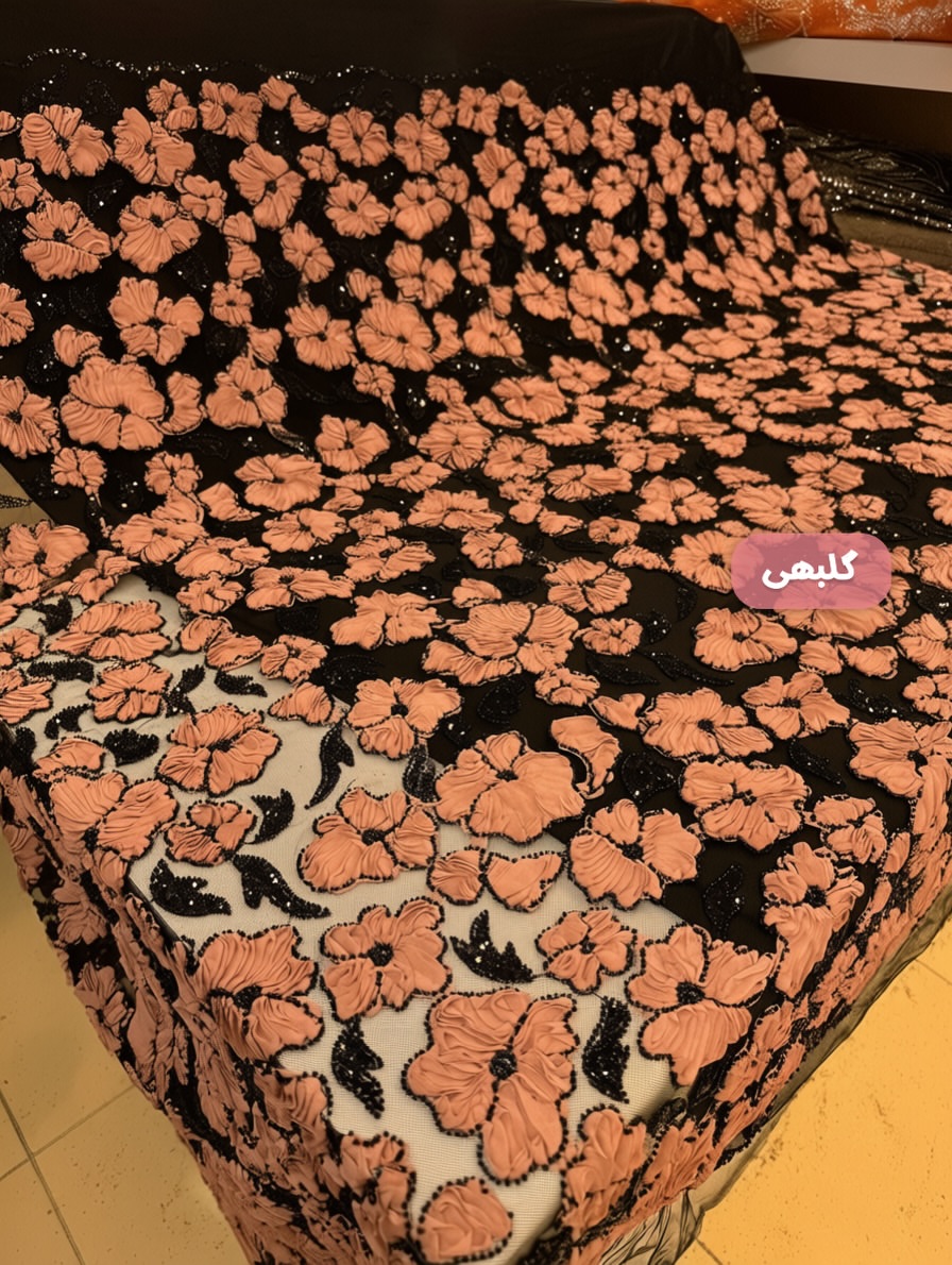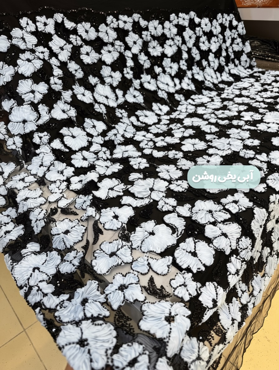 ورق بزنیدبازشده رنگبندی گل برجسته حریر دوزی با منجوق های درخشان و پولک آیینهای با زمینه مشکی در ٧ رنگ اختصاصی و خاص عرض مفید حدود 135 سانت متری
