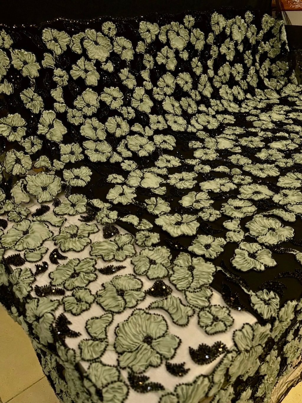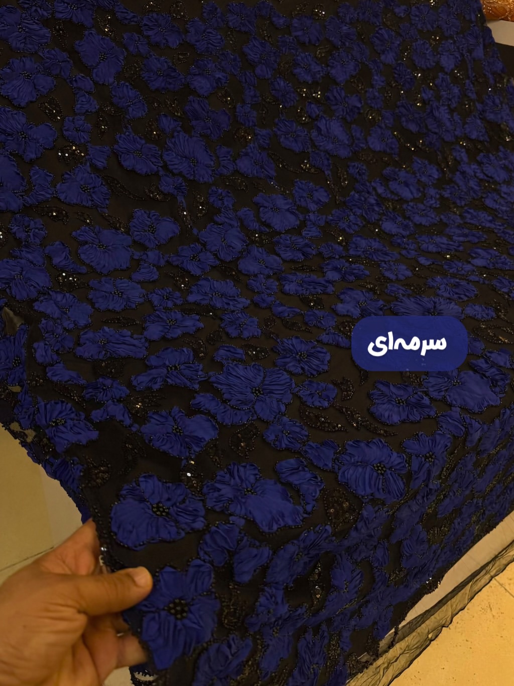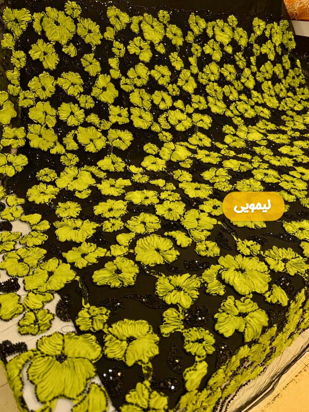 ورق بزنیدبازشده رنگبندی گل برجسته حریر دوزی با منجوق های درخشان و پولک آیینهای با زمینه مشکی در ٧ رنگ اختصاصی و خاص عرض مفید حدود 135 سانت متری