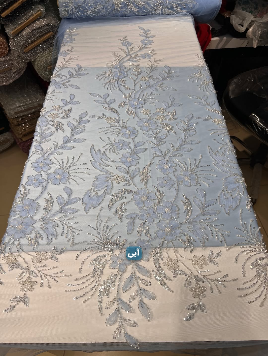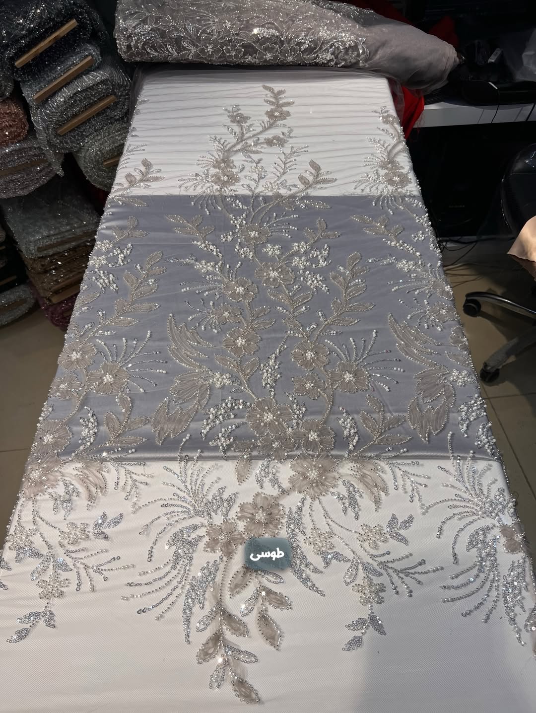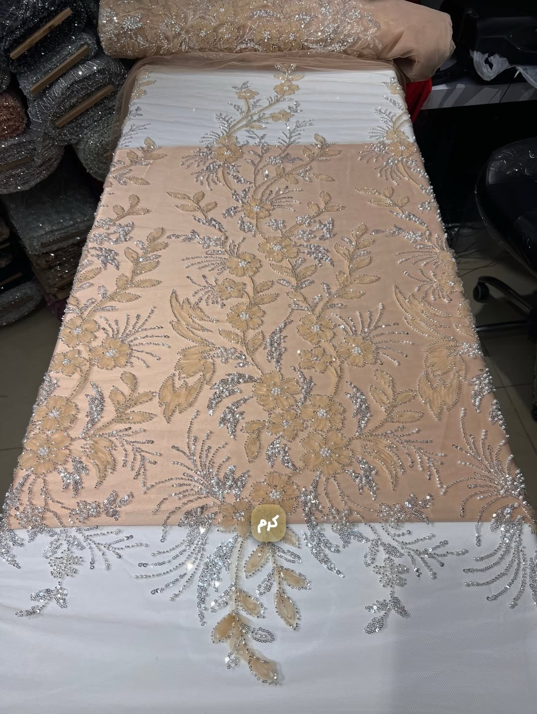 پارچه با دیزاین جدید و دخترونه بسیار سبک و درخشان مناسب دوخت انواع لباس های مجلسی و محلی. دارای جزییات شامل تور مزنی باکیفیت، منجوق های شیشه ای و کریستالی درخشان، پولک های ریز آیینه ای و مروارید صدفی گل برجسته.
