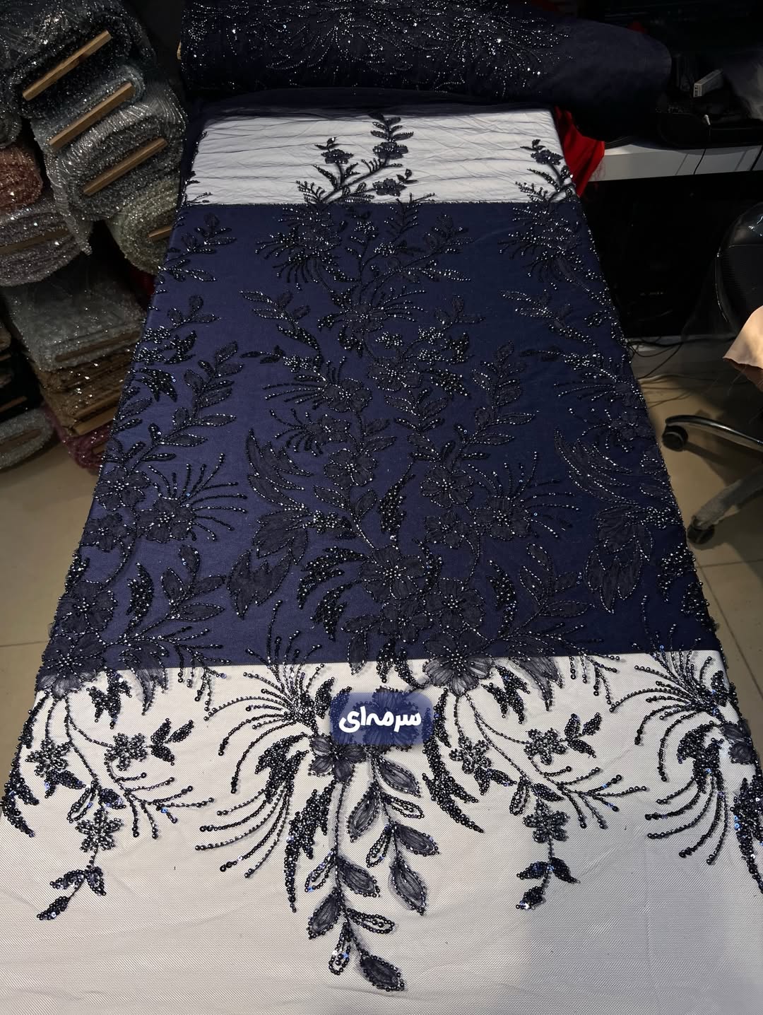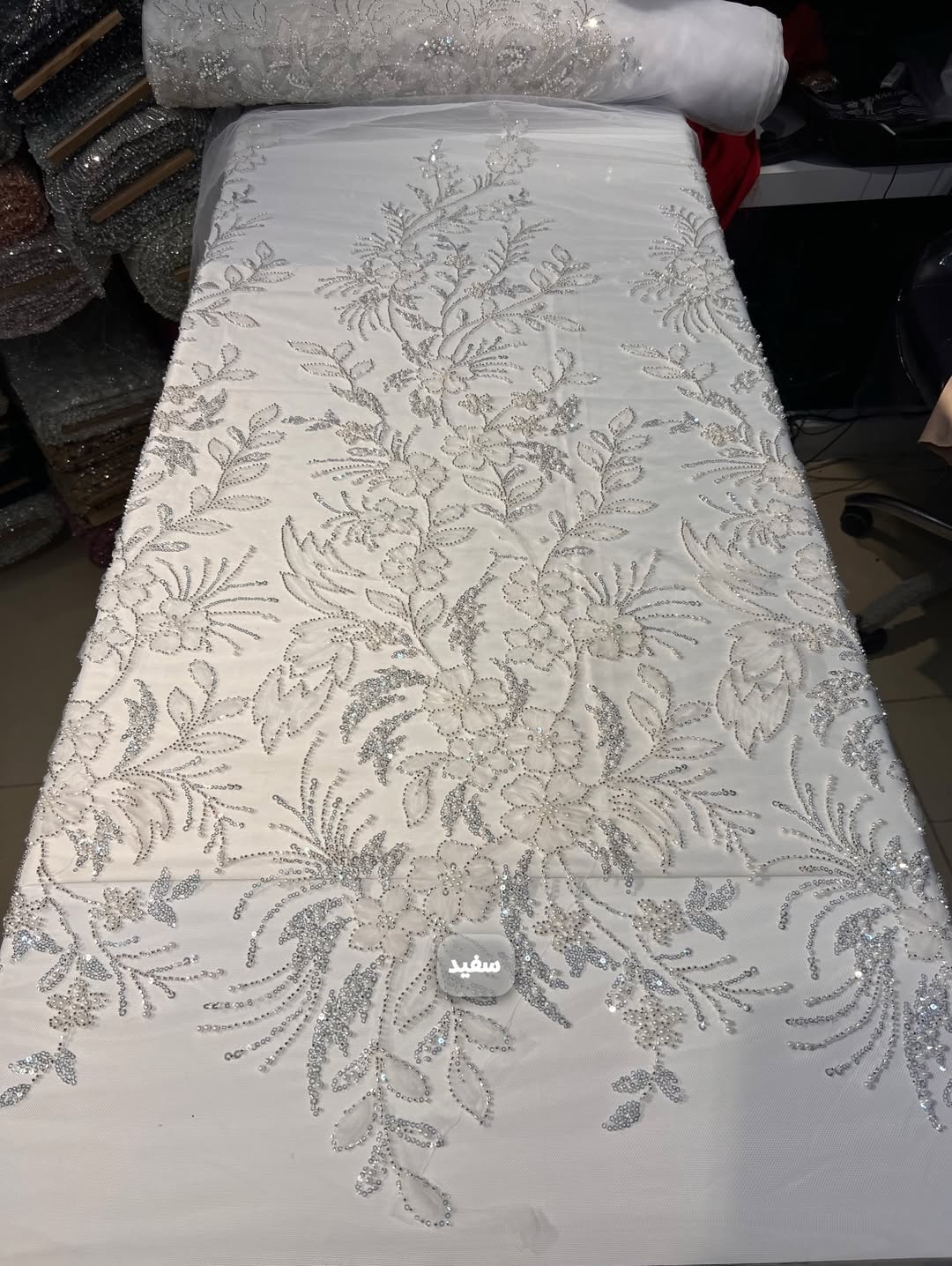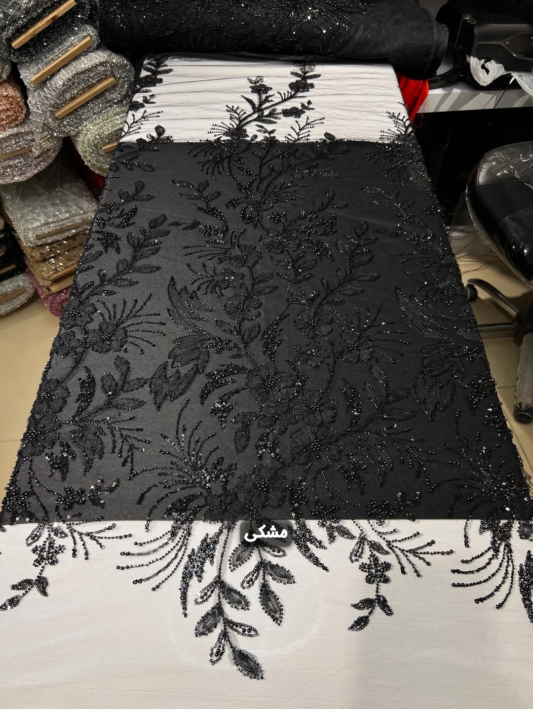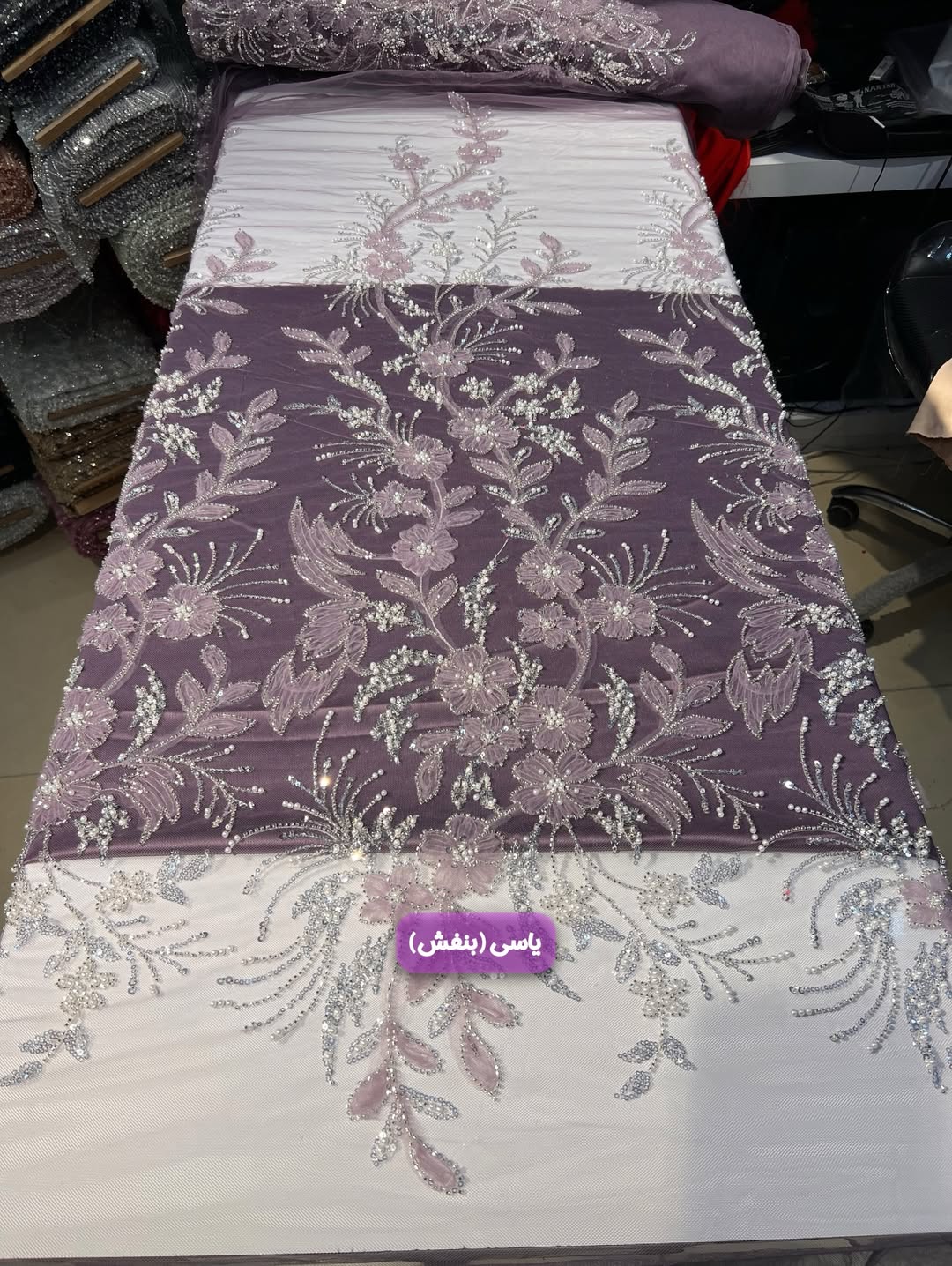 پارچه با دیزاین جدید و دخترونه بسیار سبک و درخشان مناسب دوخت انواع لباس های مجلسی و محلی. دارای جزییات شامل تور مزنی باکیفیت، منجوق های شیشه ای و کریستالی درخشان، پولک های ریز آیینه ای و مروارید صدفی گل برجسته.